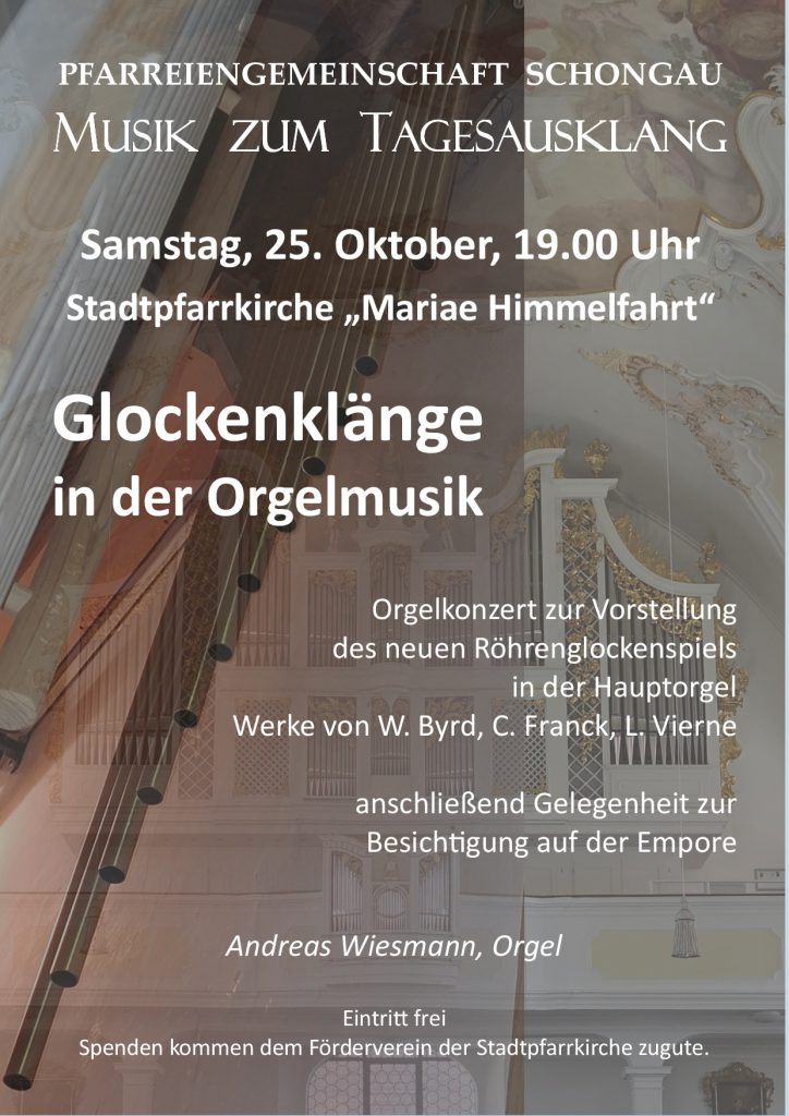 Das Kirchweihfest feiern wir am Festtag-Vorabend, Sa, 18.10.25 um 18.00 Uhr in der Pfarrkirche Verklärung Christi, sowie am Kirchweih-Sonntag, 19.10.25, um 10.00 Uhr in der Stadtpfarrkirche Mariae Himmelfahrt. Am Sonntag wird der Gottesdienst vom Kirchenchor mit der „Orgelsolomesse“ von W.A. Mozart musikalisch umrahmt.