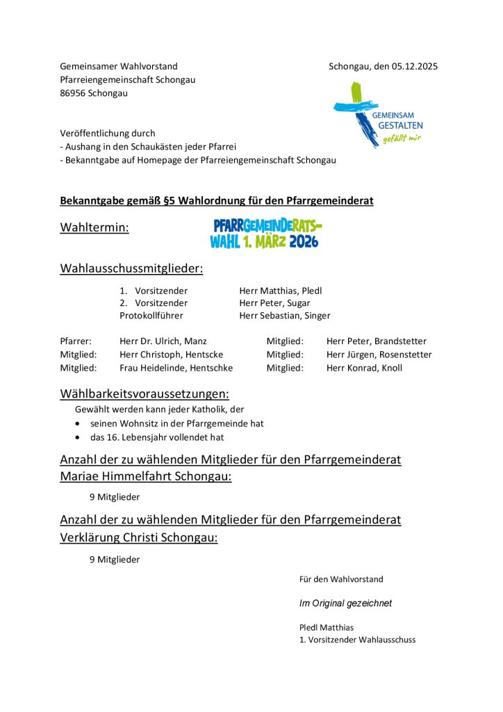 Firmung 2026: Wer aus der 8. Jahrgangsstufe am Firmsakrament interessiert ist, der soll sich per Telefon (08861-71712 od. 4432) oder E-Mail (pg.schongau@bistum-augsburg.de) in einem unserer Pfarrbüros melden.