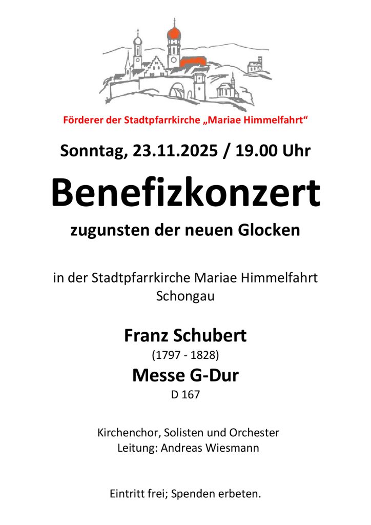 Zum Benefizkonzert am So, 23.11.25 um 19.00 Uhr mit Musik zum Ausklang des Kirchenjahres am Christkönigs-Sonntag lädt der Förderverein der Stadtpfarrkirche Mariae Himmelfahrt recht herzlich ein. Der Kirchenchor, Solisten und das Orchester unter der Leitung von Andreas Wiesmann spielen von Franz Schubert die Messe in G-Dur. Der Eintritt ist frei, Spenden werden erbeten. Der Erlös kommt dem Förderverein der Stadtpfarrkirche zugunsten der neuen Glocken zugute.