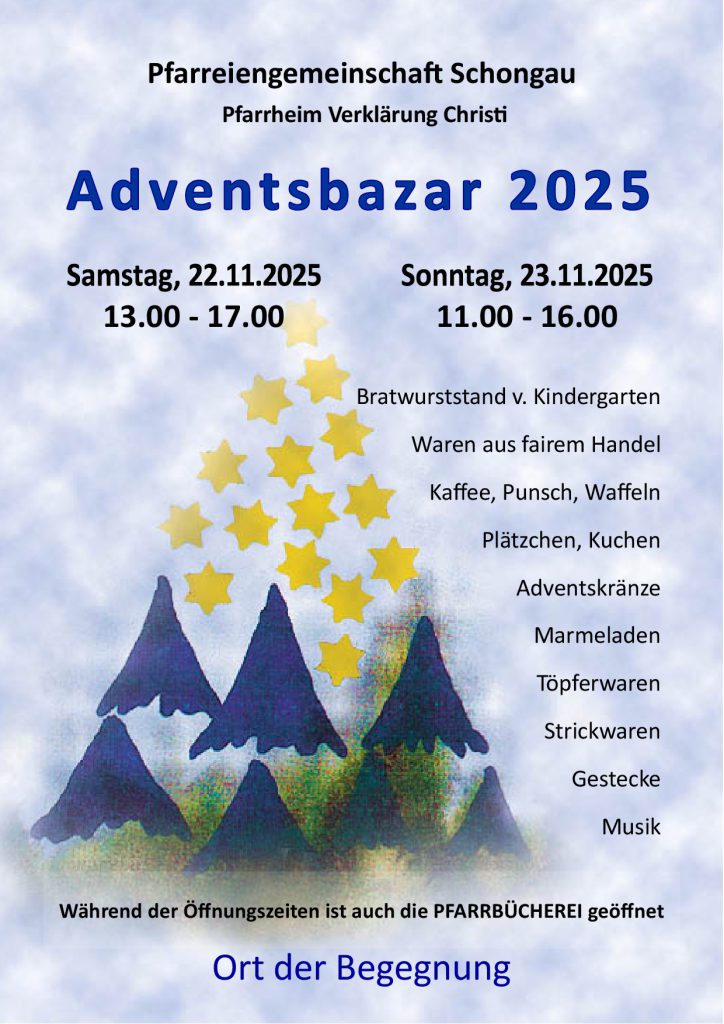 Herzliche Einladung zum Adventsbasar im Pfarrsaal Verklärung Christi am Sa, 22.11.25 von 13.00 – 17.00 Uhr und So, 23.11.25 von 11.00 – 16.00 Uhr. Zu Beginn werden am Samstag die gebundenen Adventskränze gesegnet und anschließend verkauft. Bei Kaffee, Punsch, Kuchen, Waffeln und Plätzchen kann man viel Schönes und Nützliches, wie Marmeladen, Töpfer- und Strickwaren, Waren aus fairem Handel und vieles mehr erwerben. Musikalisch wird die Veranstaltung von der Musikschule Pfaffenwinkel umrahmt. Auch die Pfarrbücherei ist geöffnet u. der Kindergarten St. Johannes bietet Bratwurstsemmeln an.