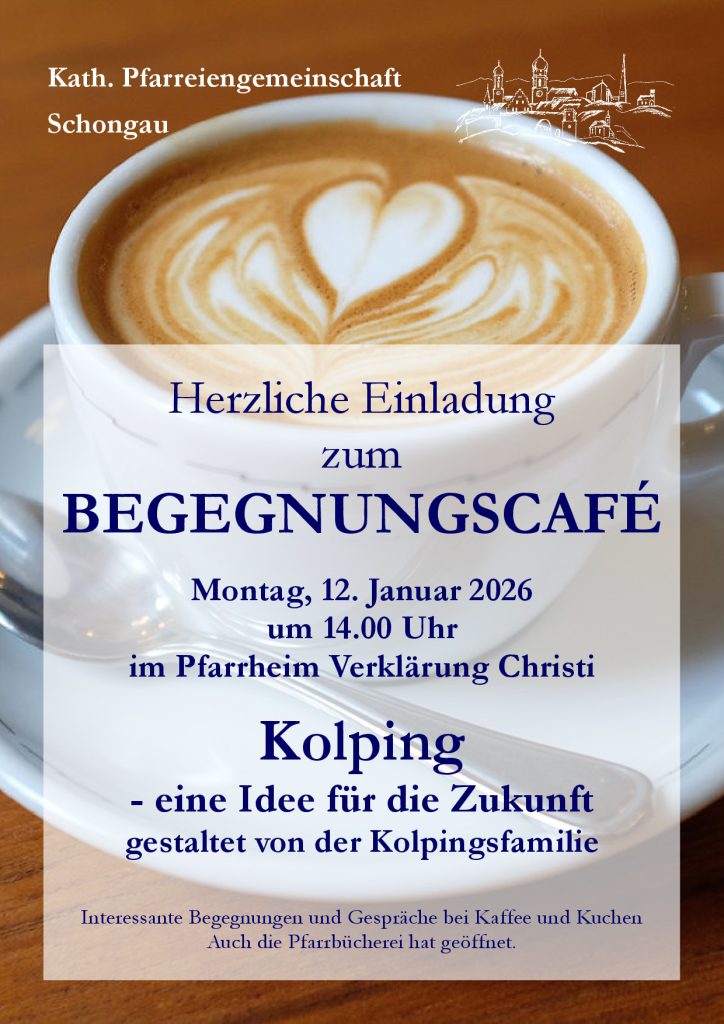 Herzliche Einladung zum ersten Begegnungscafé im neuen Jahr am Mo, 12.01.26 um 14.00 Uhr im Pfarrsaal Verklärung Christi bei dem die Kolpingsfamilie den Nachmittag mit dem Thema: „Kolping – eine Idee für die Zukunft“ gestaltet. Wir freuen uns auf interessante Begegnungen und Gespräche bei Kaffee und Kuchen. Auch die Pfarrbücherei hat geöffnet.