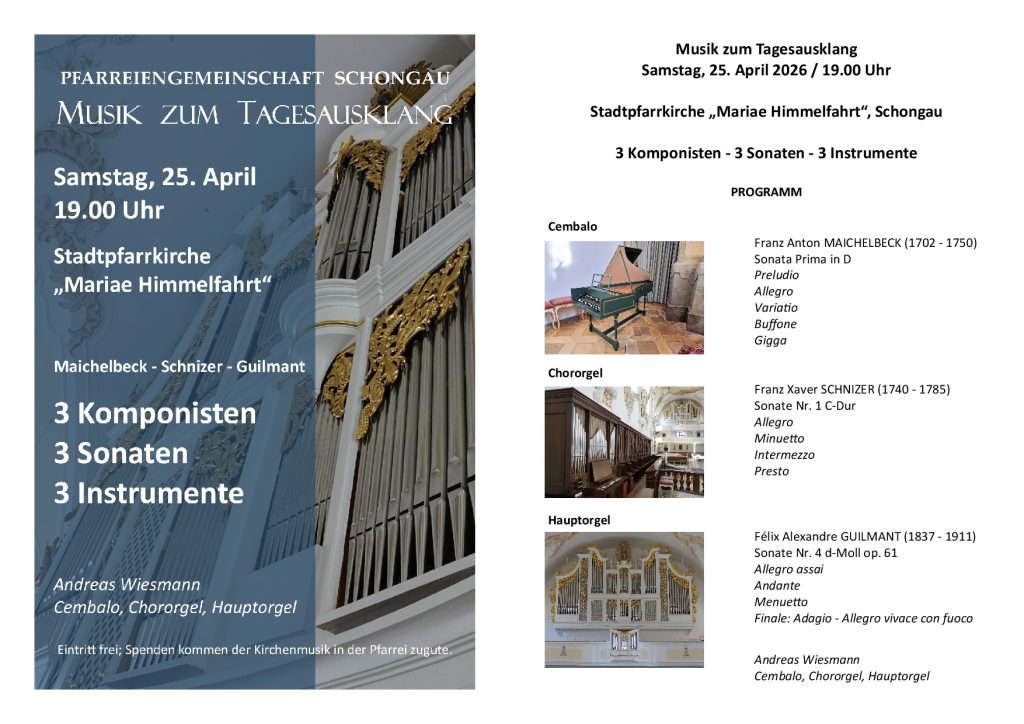 Die Pfarreiengemeinschaft Schongau lädt zur Musik zum Tagesausklang am Sa, 25.04.26 um 19.00 Uhr in die Stadtpfarrkirche Mariae Himmelfahrt recht herzlich ein. Unser Organist Andreas Wiesmann lässt drei Komponisten (Maichelbeck – Schnizer – Guilmant) mit drei Sonaten auf drei Instrumenten erklingen. Der Eintritt ist frei, Spenden kommen der Kirchenmusik in der Pfarrei zugute.