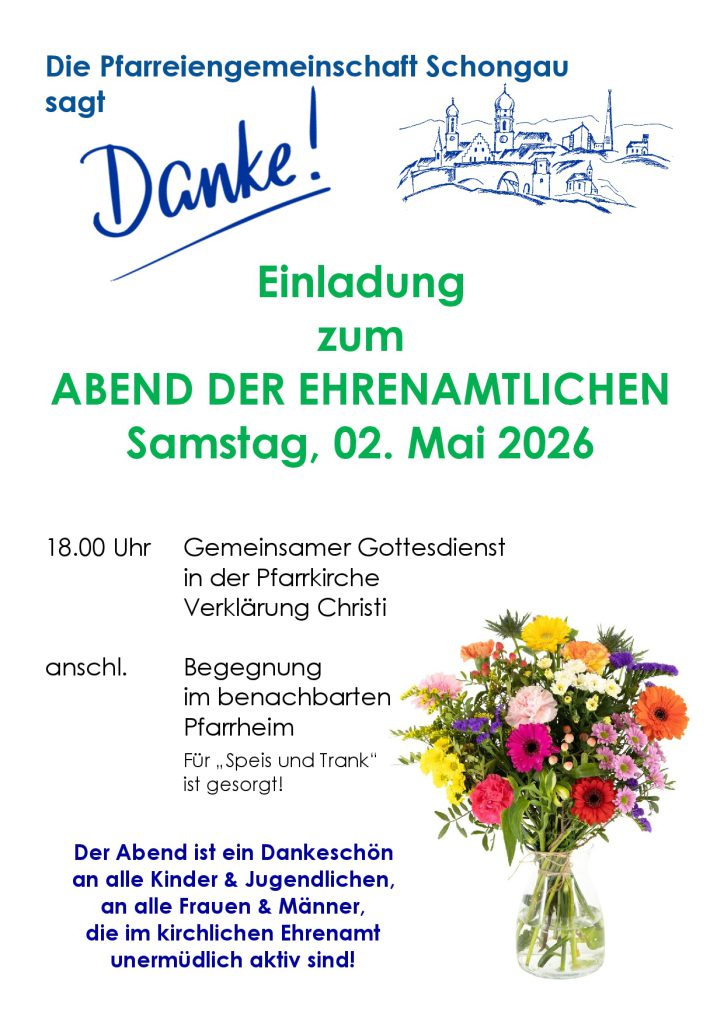 Herzliche Einladung an alle Kinder, Jugendlichen, Frauen und Männer die im kirchlichen Ehrenamt aktiv sind zum „Abend der Ehrenamtlichen“ am Sa, 02.05.26 um 18.00 Uhr. Wir beginnen mit einem gemeinsamen Gottesdienst in der Pfarrkirche Verklärung Christi und anschließender Begegnung im benachbarten Pfarrheim. Für Speis und Trank ist gesorgt! Wir freuen uns auf zahlreiches Erscheinen!.